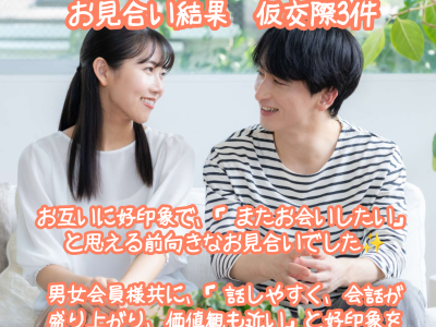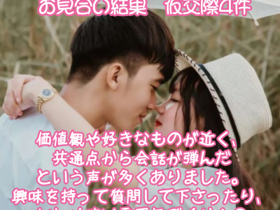 10月20日〜10月26日婚活 お見合い結果 仮交際6件 ✨お見合い結果総括✨全体的に、会話が自然に弾み、楽しく過ごせたことや、明るく穏やかな人柄に好印象を持たれたことが交際成立の主な理由として挙げられました☺️...
