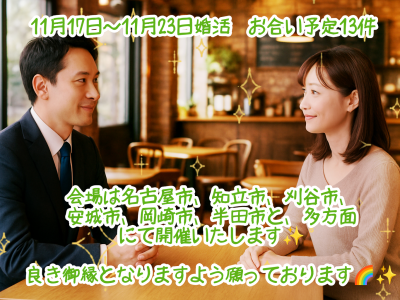 11月10日〜11月15日婚活 お見合い結果 仮交際3件 今週も、お互いに「またお会いしたい」と思える前向きなお見合いがありました✨️ ▼男性会員さまより「清楚でおしゃれな方で、質問も多く会話が盛り上がり、価値観...