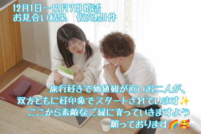 2025年12月09日(火) 12月1日〜12月7日 婚活 お見合い結果✨️ 12月1日〜12月7日婚活 お見合い結果 仮交際1件 今週は 仮交際1件 でした☺️旅行好きで価値観が近いお二人が、双方ともに好印象でスタートされています✨ここから素敵なご縁に育っていきますよう願っております♡ そして、今回はご縁に繋がらなかった皆さまも、お見合いで得た気づきや経験は必ず次のご縁に活きてきます☺️私たちカウンセラーもしっかりサポートして参りますので、一緒に前へ進んでいきましょう✨️ 今週も皆さま本当にお疲れさまでした。来週もまた、素敵なご縁と出会えますように✨
