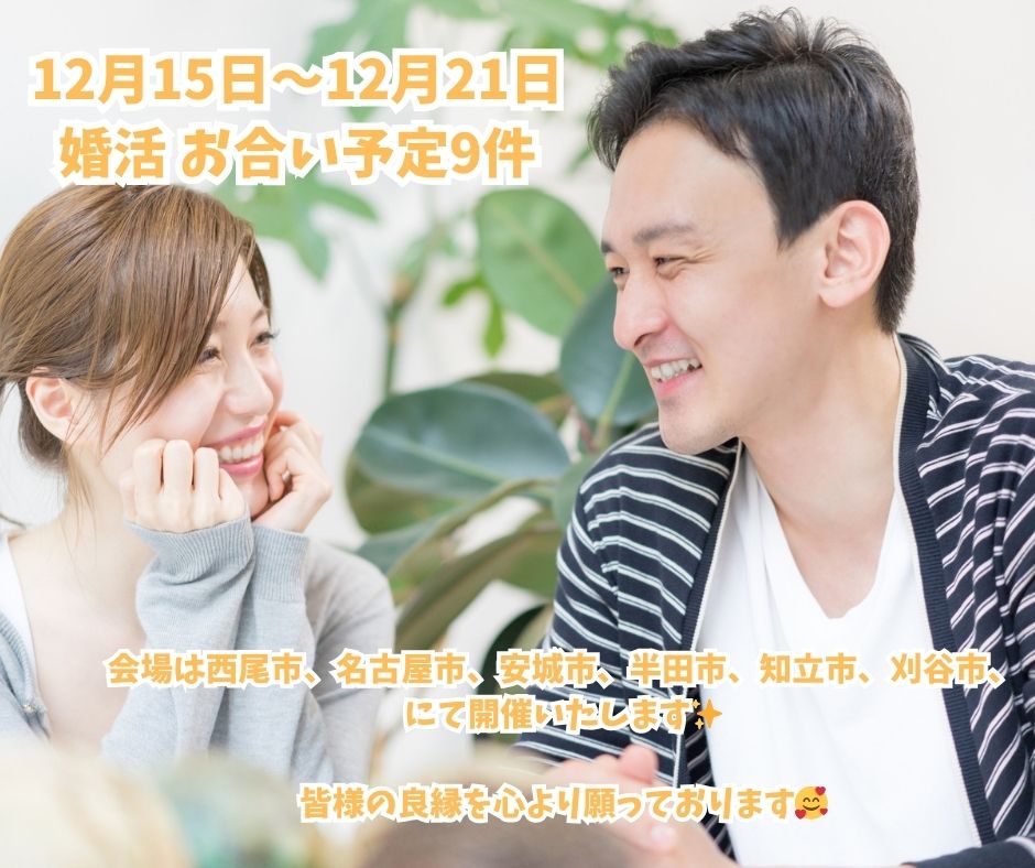 2025年12月19日(金) 婚活お見合い予定 12月15日〜12月21日婚活 お合い予定9件 会場は西尾市、名古屋市、安城市、半田市、知立市、刈谷市、にて開催いたします✨ 皆様の良縁を心より願っております