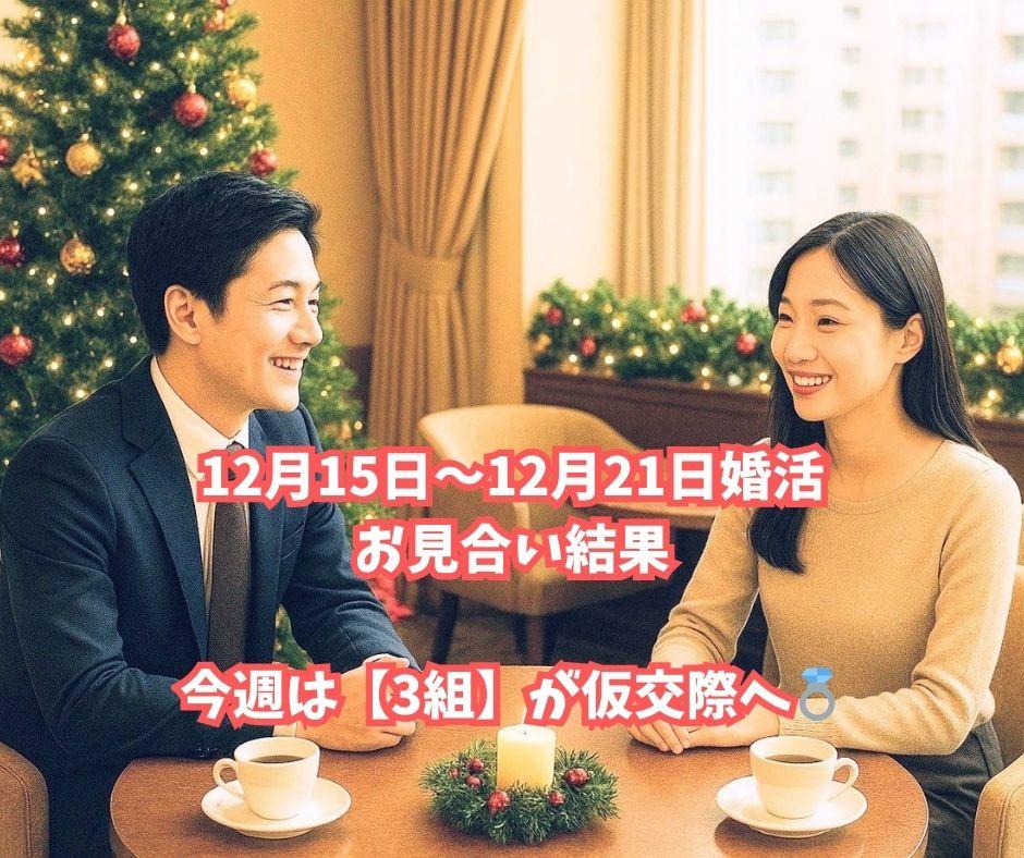 2025年12月23日(火) ♡12月15日〜12月21日 お見合い結果♡ 12月15日〜12月21日婚活 お見合い結果 今週は【3組】が仮交際へ♡ 決め手は… ・緊張せず自然に話せたこと ・食や趣味から広がる価値観の一致 ・穏やかさ、清潔感、丁寧な言葉遣い 条件よりも「一緒にいる想像ができた」 そんな瞬間がご縁をつなぎました! 交際成立おめでとうございます✨ 実りある御縁となりますよう願っております✨ 交際の進め方やお気持ちの整理など、 それぞれの状況に応じて、 担当カウンセラーが継続的にサポートしてまいります♡