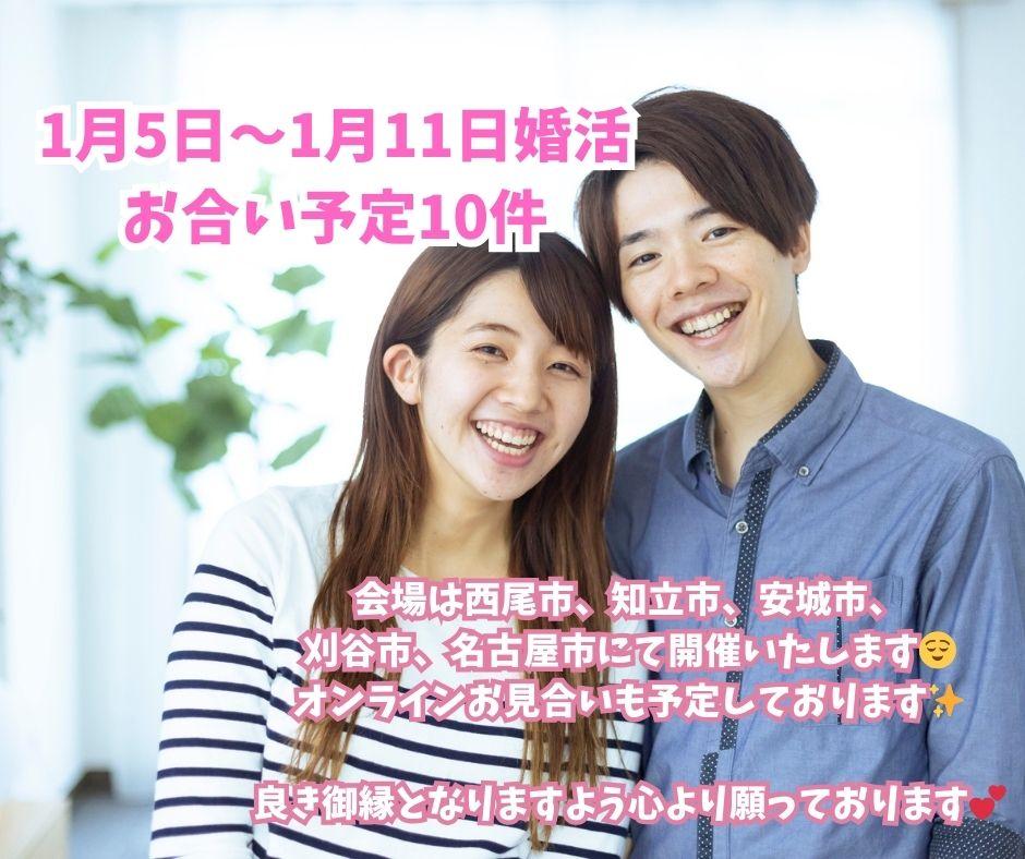 2026年01月09日(金) 1月5日~1月11日婚活 お見合い予定 1月5日〜1月11日婚活 お合い予定10件 会場は西尾市、知立市、安城市、刈谷市、名古屋市にて開催いたします! オンラインお見合いも予定しております✨ 良き御縁となりますよう心より願っております♡