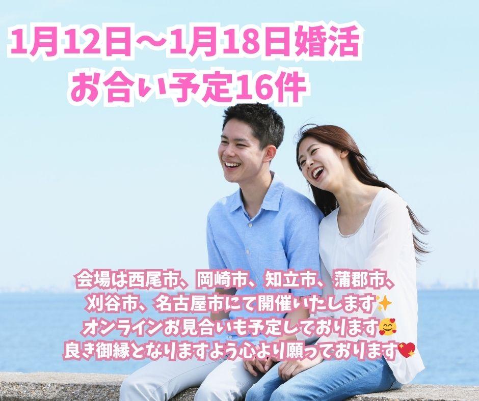 2026年01月16日(金) NEW 1月12日〜1月18日婚活 お合い予定 1月12日〜1月18日婚活 お合い予定16件 会場は西尾市、岡崎市、知立市、蒲郡市、刈谷市、名古屋市にて開催いたします✨ オンラインお見合いも予定しております! 良き御縁となりますよう心より願っております♡