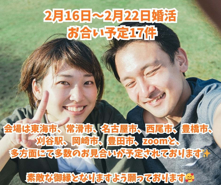 2026年02月21日(土) NEW ♡2月16日〜2月22日婚活 お見合い予定♡ 2月16日〜2月22日婚活 お合い予定17件 会場は東海市、常滑市、名古屋市、西尾市、豊橋市、刈谷駅、岡崎市、豊田市、zoomと、多方面にて多数のお見合いが予定されております✨ 素敵な御縁となりますよう願っております!!