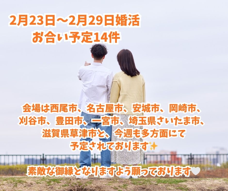 2026年02月27日(金) NEW 2月23日〜2月29日婚活 お合い予定 2月23日〜2月29日婚活 お合い予定14件 会場は西尾市、名古屋市、安城市、岡崎市、刈谷市、豊田市、一宮市、埼玉県さいたま市、滋賀県草津市と、今週も多方面にて予定されております✨ 素敵な御縁となりますよう願っております!