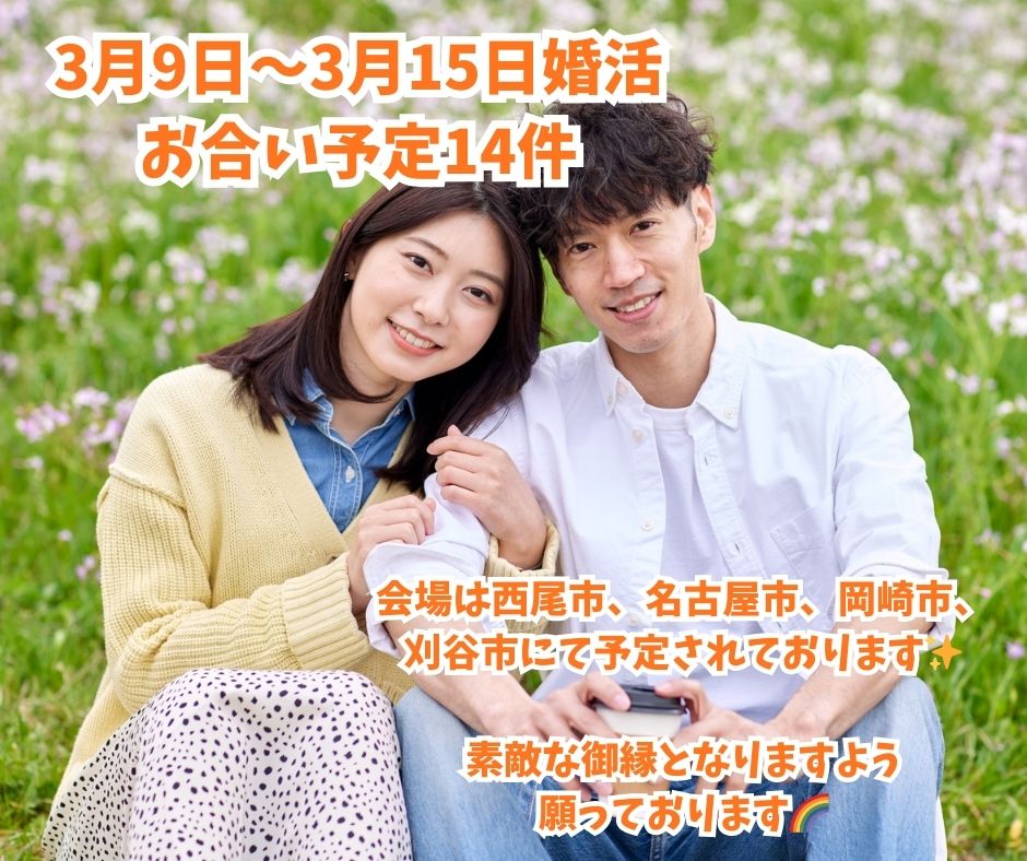2026年03月13日(金) NEW 3月9日〜3月15日婚活 お合い予定 3月9日〜3月15日婚活 お合い予定14件 会場は西尾市、名古屋市、岡崎市、刈谷市にて予定されております✨ 素敵な御縁となりますよう願っております!