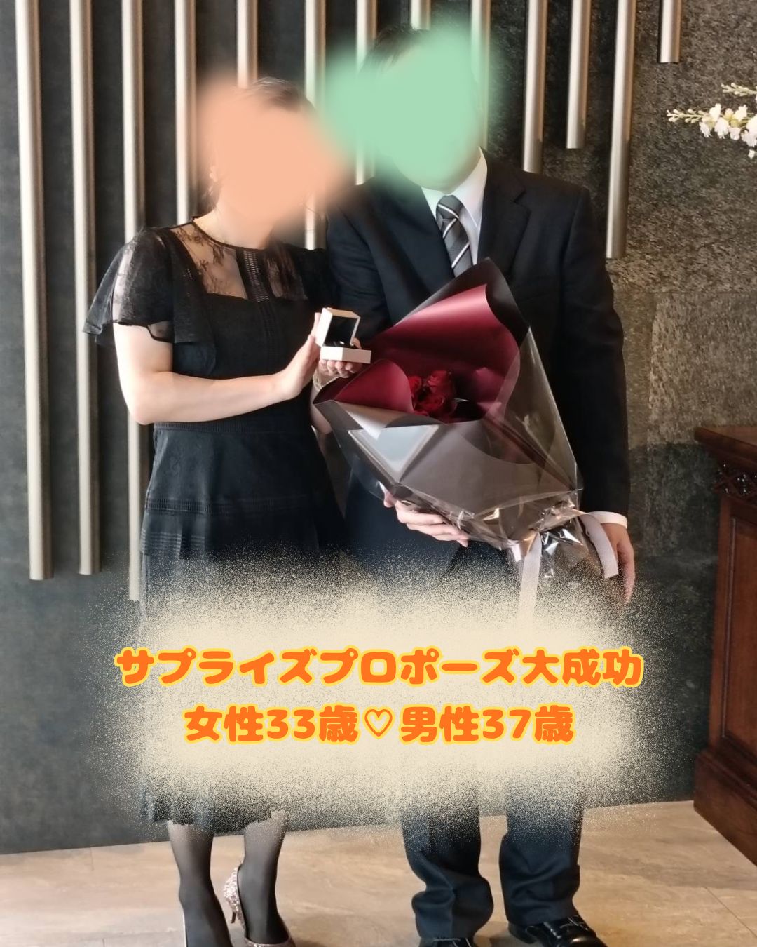 2025年12月17日(水) サプライズプロポーズ 大成功 女性33歳♡男性37歳 交際5ヶ月✨ 交際スタートから会話はいつも弾み、会うたびに笑顔が溢れる日々を重ねてこられました。 結婚を意識し始めた頃、ふと不安に揺れる時期も。 それでも、その想いを大きな心で受け止め、そっと支えてくれた彼の存在が、彼女の背中を優しく押してくれました そして―― 彼からのサプライズプロポーズ♡ 嬉しさと幸せに包まれた、最高の瞬間!! これから始まるおふたりの人生が、笑顔と愛に満ちた毎日となりますように…♡